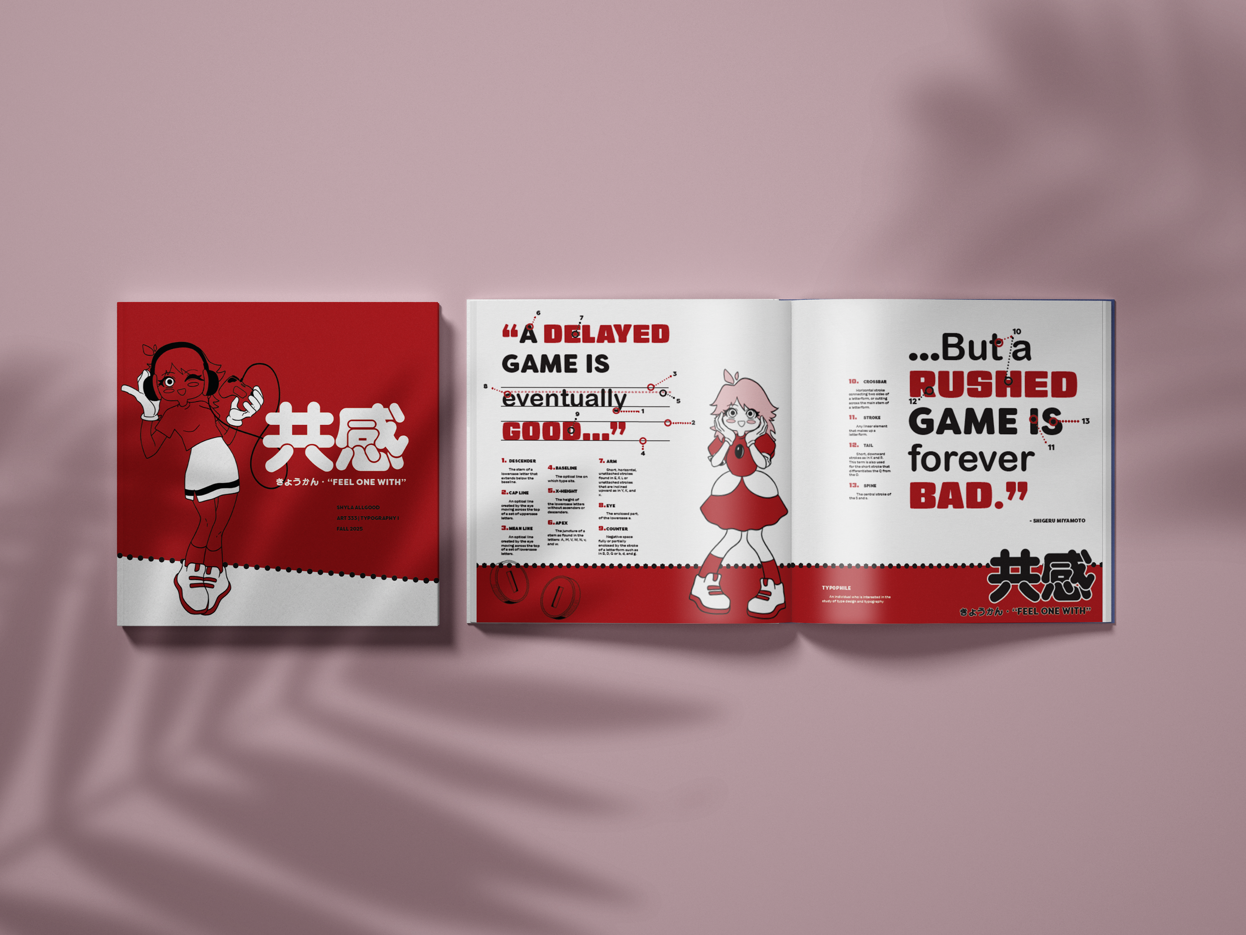 The quote provided in the booklet is from Shigeru Miyamoto, a Nintendo Game Designer and Director. This designer inspired my color choice and illustration style to match the Nintendo cartoon approach to character illustrations.